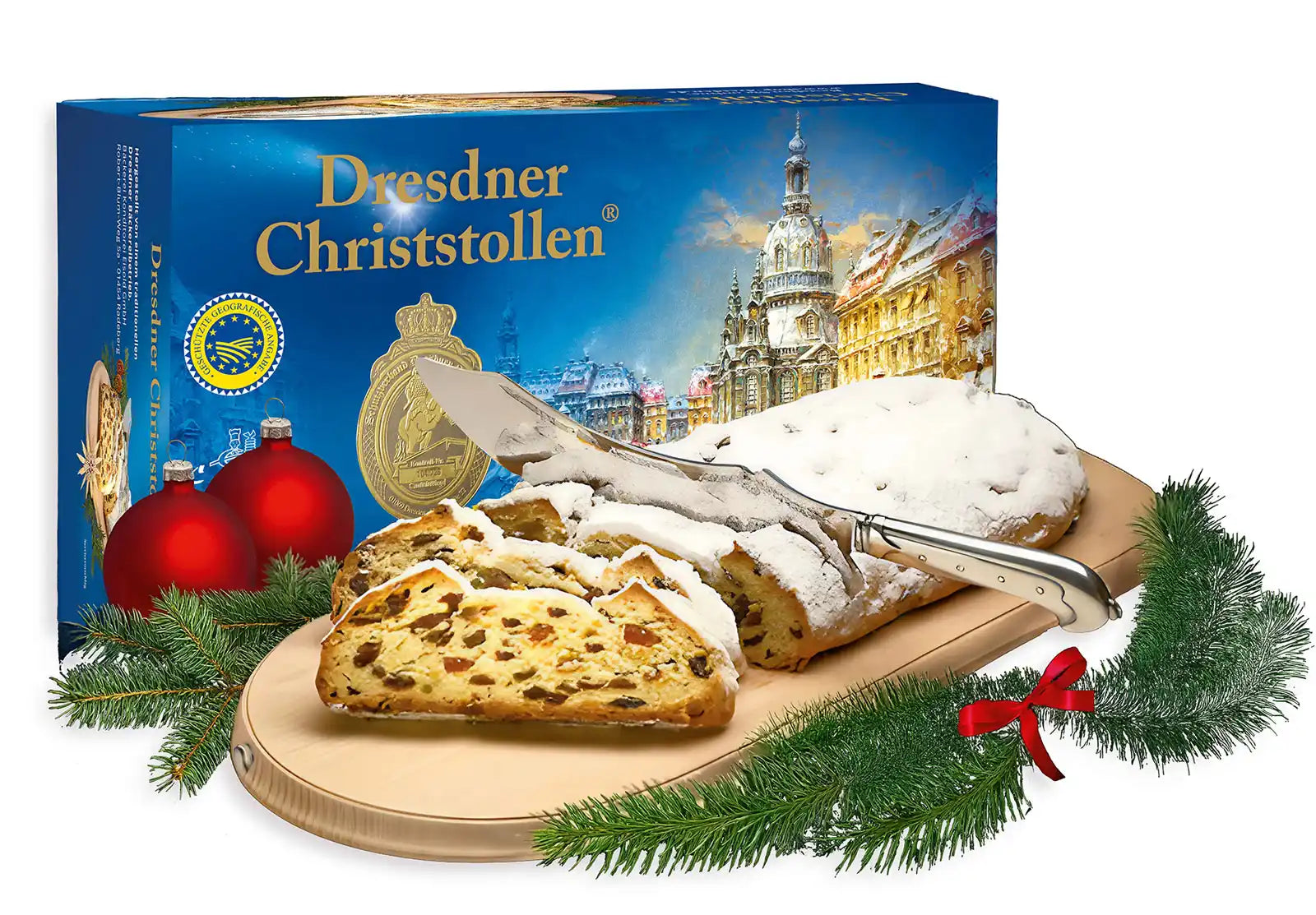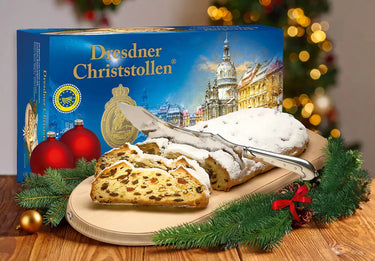Der Dresdner Christstollen wird nach einem traditionellen Rezept mit hochwertigen Zutaten wie Butter, Mandeln, Rosinen, Zitronat und Orangeat hergestellt. Er ist durch eine geschützte geografische Angabe (g.g.A.) geschützt, was bedeutet, dass nur Stollen, die in Dresden und nach festgelegten Standards gebacken werden, diesen Namen tragen dürfen.
